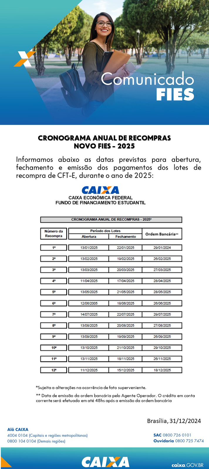 A Caixa Econômica Federal divulgou os cronogramas que estabelecem as datas para recompras, repasses e pagamento de tributos referentes ao Novo FIES em 2025. Confira abaixo: