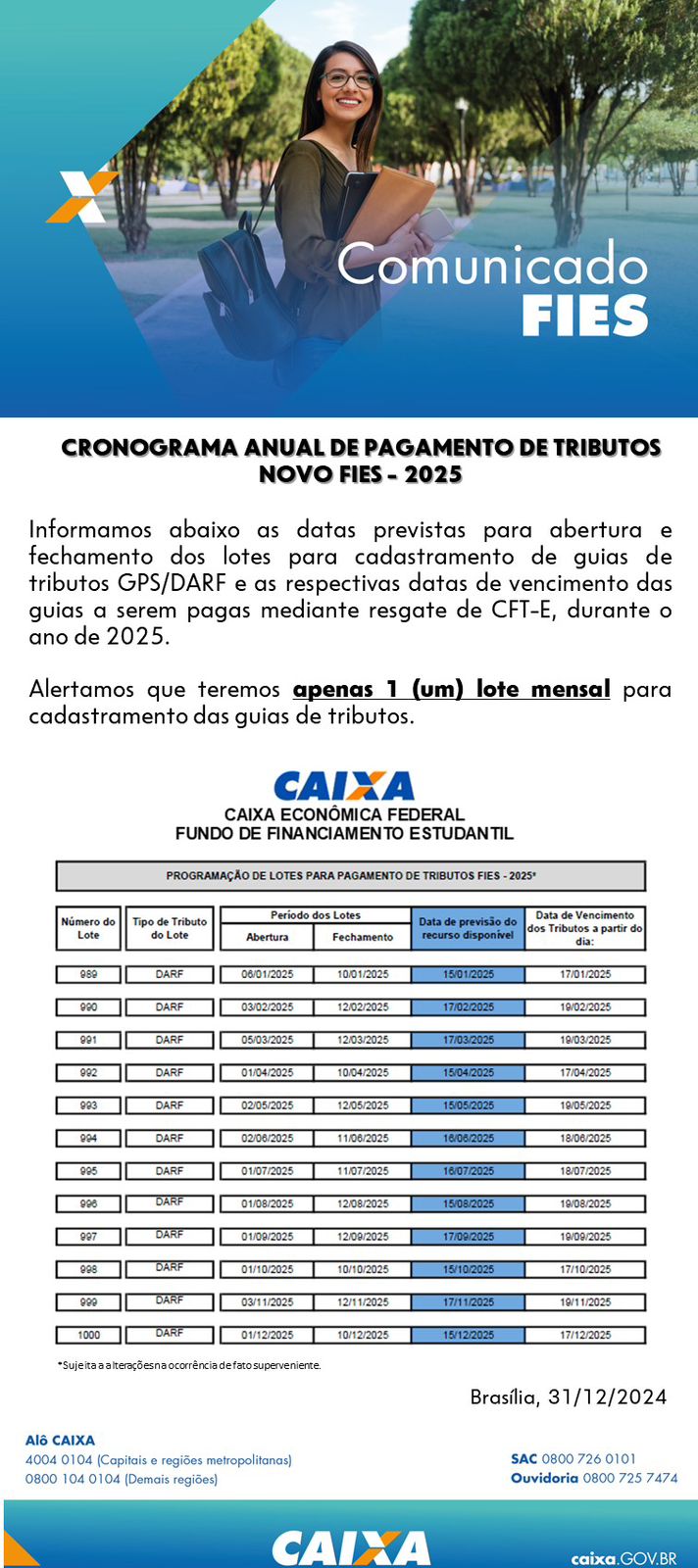 26 de janeiro de 2023A Caixa enviou comunicado para as mantenedoras das IES informando que os valores das semestralidades foram reajustados de acordo com o IPCA.